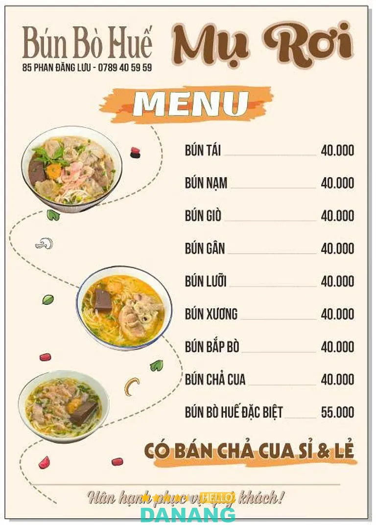 Nếu bạn đang tìm kiếm một nơi để thưởng thức bún bò Huế ngon đúng chuẩn, đừng bỏ qua Bún bò Huế Mụ Rơi – địa chỉ quen thuộc tại 85 Phan Đăng Lưu, phường Hòa Cường, quận Hải Châu, Đà Nẵng.