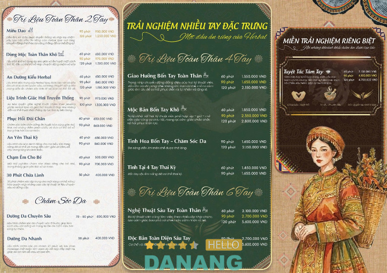 Với định hướng chăm sóc toàn diện Thân – Tâm – Trí, Herbal Spa mang đến hệ thống liệu trình massage thảo mộc, massage đá nóng, massage body Đà Nẵng chuyên sâu và chăm sóc da chuẩn mực, giúp bạn tái tạo năng lượng giữa nhịp sống sôi động của thành phố biển. Bên cạnh đó, các gói combo được thiết kế riêng biệt giúp khách hàng dễ dàng lựa chọn món quà sức khỏe hoàn hảo cho bản thân, bạn bè hoặc những người thân yêu.
