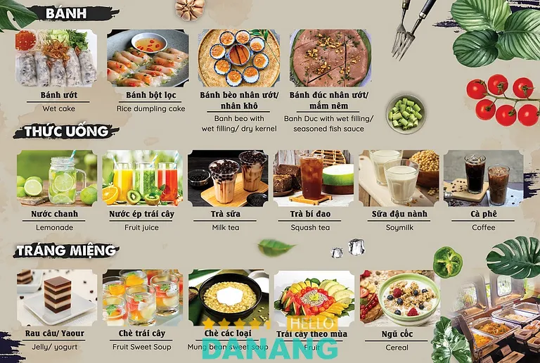 Không thể thiếu trong thực đơn là những món ăn trứ danh miền Trung – quê hương của chính Đà Nẵng. Mì Quảng tôm thịt, bánh bèo – bánh nậm – bánh lọc, bún bò Huế, cá lăng om chuối đậu… đều được chế biến chuẩn vị, nêm nếm vừa miệng, mang chút cay nồng đặc trưng mà ai từng thử qua đều khó quên.