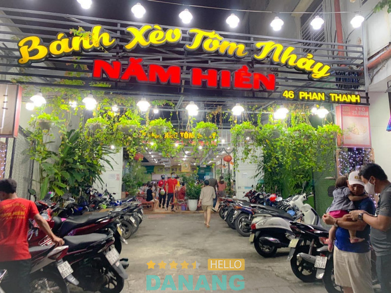Bánh xèo tôm nhảy Năm Hiền là một trong những quán ăn địa phương nổi tiếng tại Đà Nẵng, đặc biệt thu hút thực khách nhờ món bánh xèo giòn rụm, thơm ngon. Khác với nhiều nơi khác, quán sử dụng những con tôm tươi còn nhảy, được lựa chọn kỹ lưỡng, khi cho vào chảo nóng sẽ giữ được độ ngọt tự nhiên và săn chắc. Bánh xèo ở đây có lớp vỏ mỏng vừa, giòn tan nhưng không bị ngấy, kết hợp cùng giá đỗ, hành tươi và rau sống xanh mát, tạo nên hương vị hài hòa khó quên.